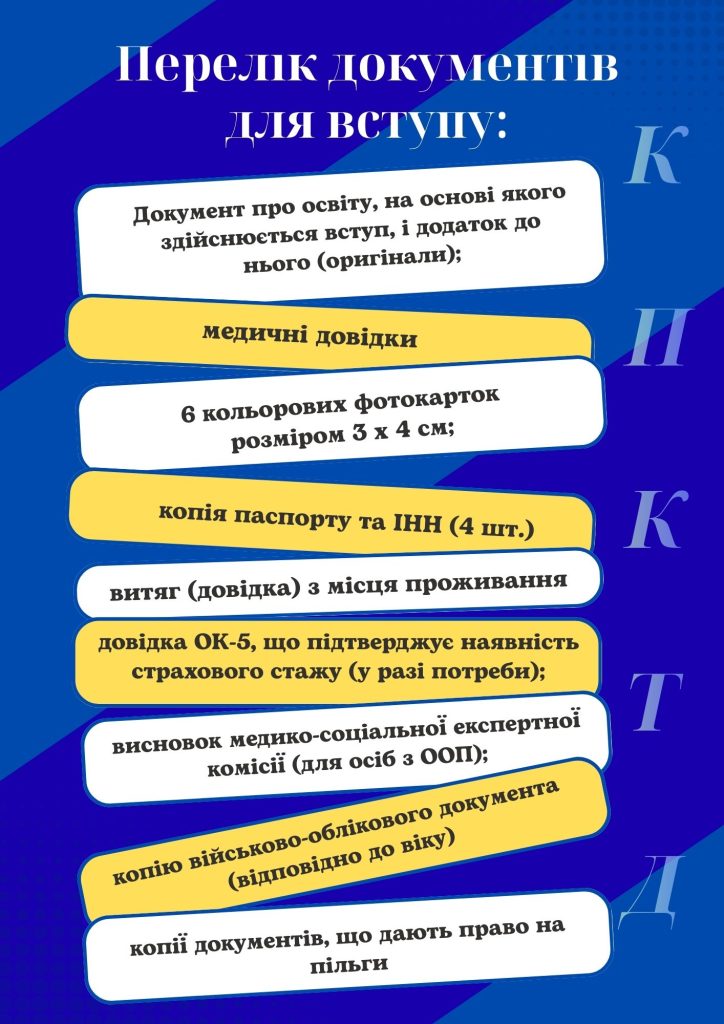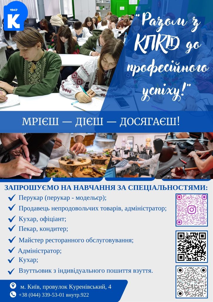 Київський професійний коледж технологій та дизайну здійснює професійну підготовку спеціалістів на базі повної загальної середньої освіти (11 класів) та на базі базової середньої освіти (9 класів) у межах ліцензійного обсягу та затвердженого регіонального замовлення за спеціальностями: